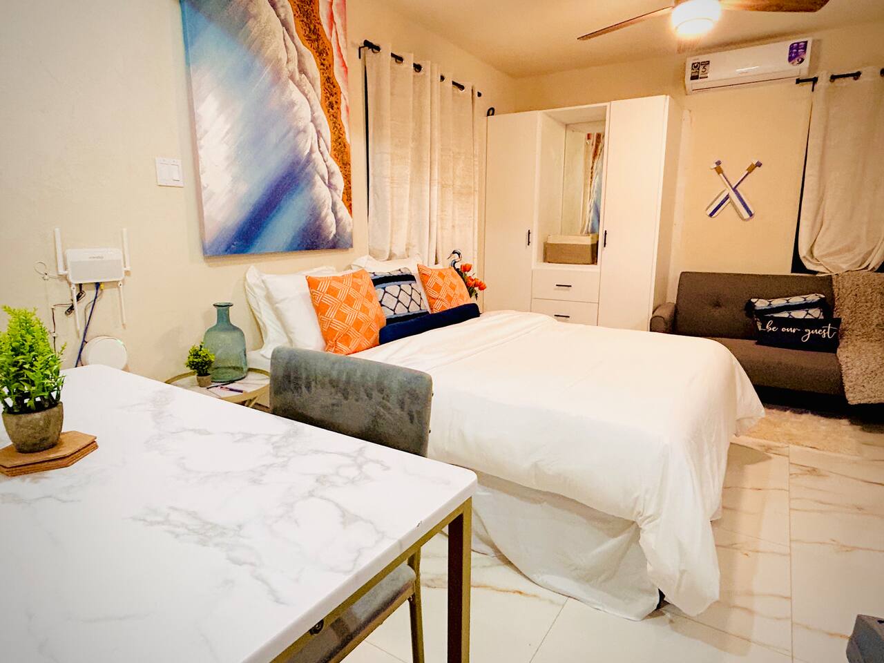 🌿 Eco-Stylish Studio in Prime South Coast Spot 🌞 Glenbeu Apartments | Rendezvous Gardens, Barbados Step into modern island living at Glenbeu’s Studio Apartment — a bright, breezy space designed for comfort, calm, and convenience. Whether you're in Barbados for business at the U.S. Embassy (just 10 minutes away), a beach escape, or a mix of both, this studio hits the sweet spot. 🛏️ Your Studio Includes: Queen-size bed with crisp linens & blackout curtains for restful sleep Sleek kitchen with gas stove, microwave, fridge & cooking basics Smart TV with Netflix & YouTube – kick back after a beach day High-efficiency AC + ceiling fan – cool comfort anytime Private spa-style bathroom with walk-in rain shower & hotel-quality towels Table for dining or remote work Thoughtful touches: full-length mirror, filtered water pitcher, iron, hair dryer 🏠 What Makes Glenbeu Special: 100% solar-powered + natural gas – stay sustainably, without compromise Modern, secure building with 24/7 smart lock access Super-fast WiFi powered by fiber + mesh – ideal for Zoom or streaming Complimentary parking & local recommendations on request 📍 Prime Location: Nestled in the quiet, residential neighborhood of Rendezvous Gardens: 10 mins to Worthing Beach, Worthing Square, Quayside Mall, and major restaurants and Massy Rendezvous Supermarket 10 mins to U.S. Embassy Close to public transport, but tucked away from the hustle